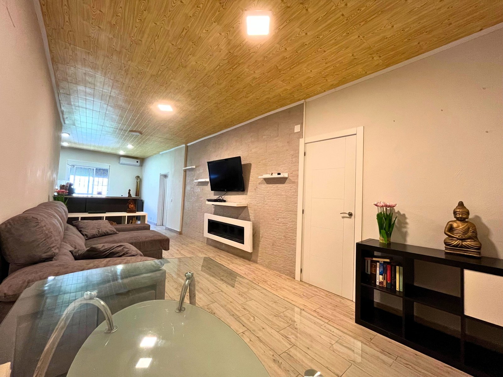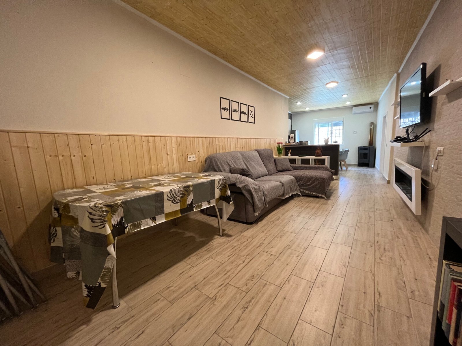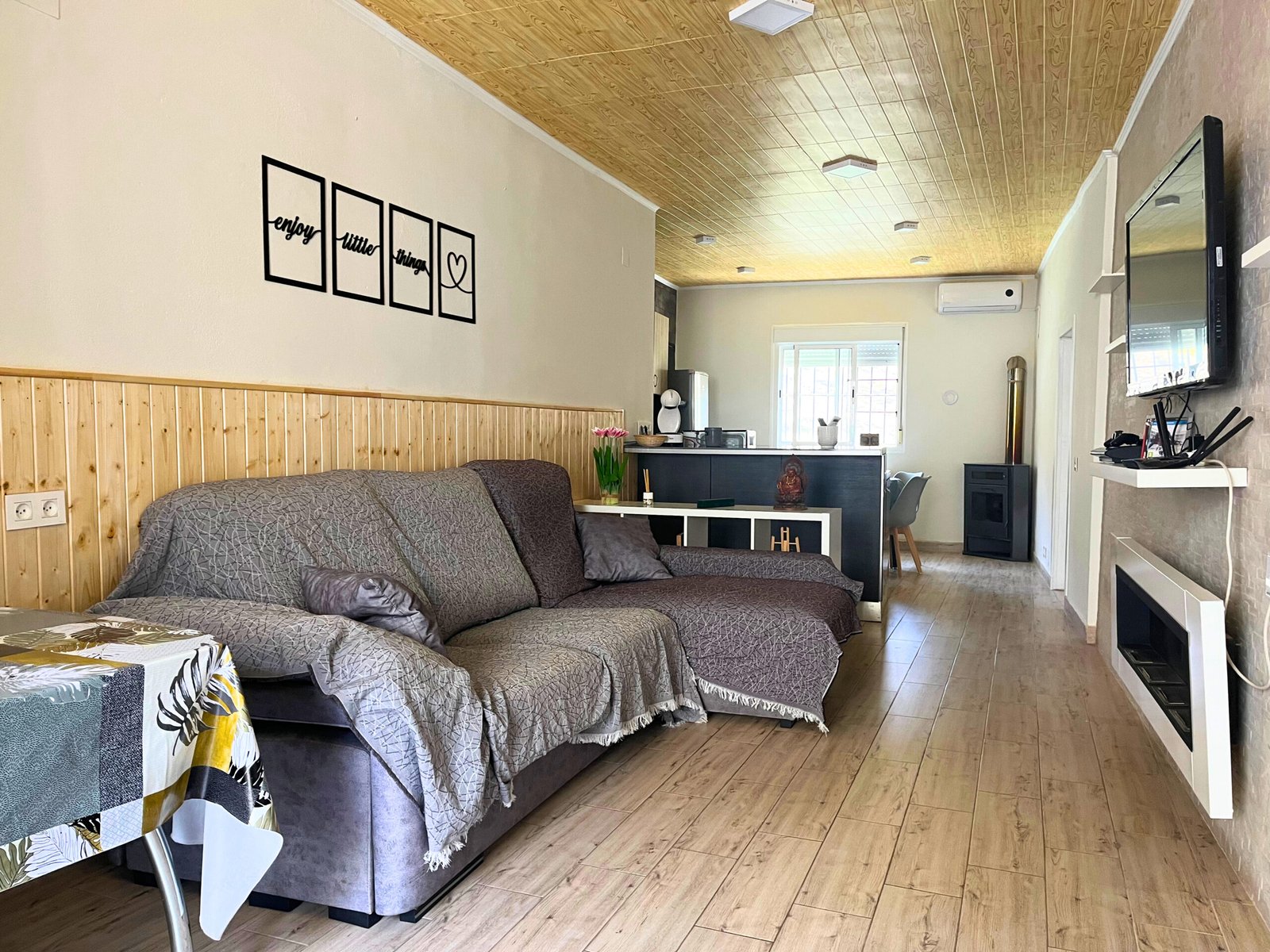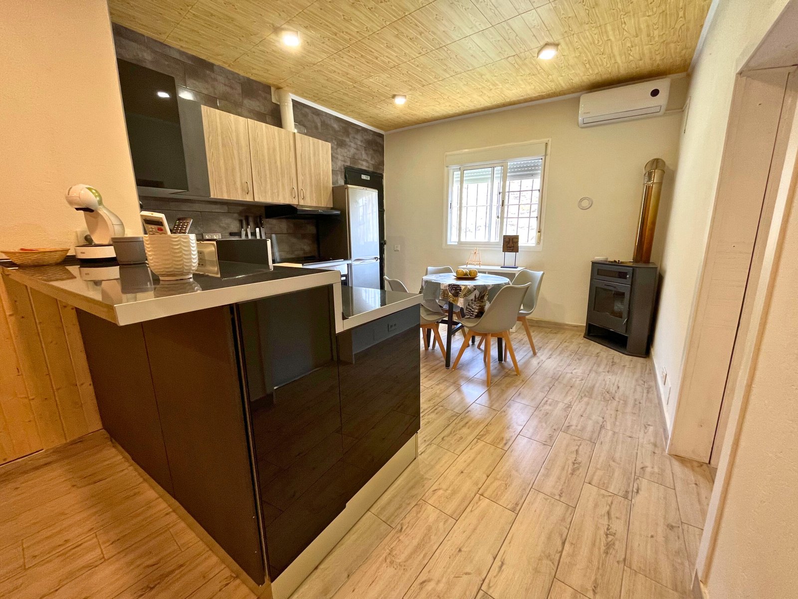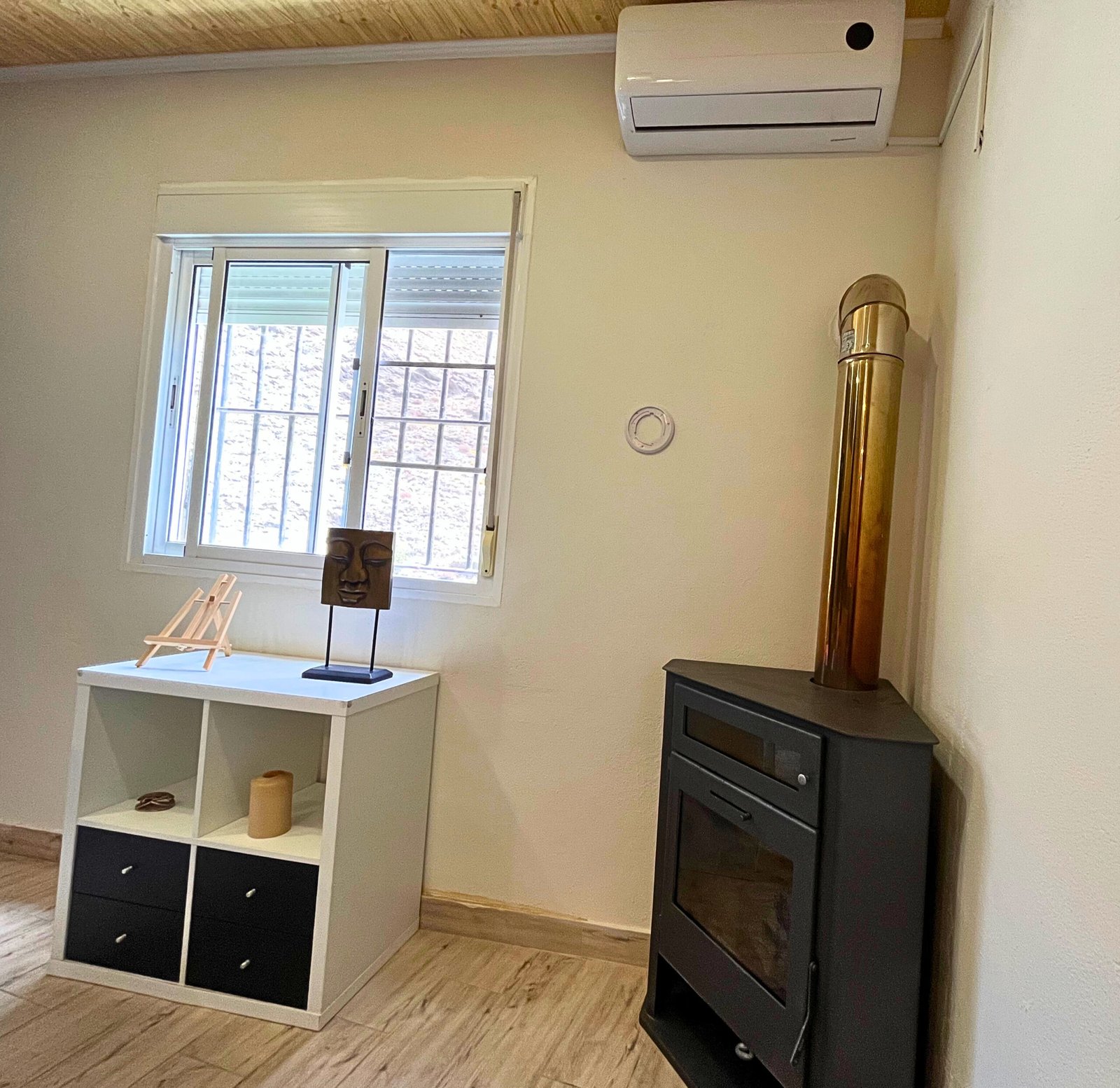 Confort Climatizado y Calidez Adicional: El salón cuenta con aire acondicionado para mantener una temperatura agradable en cualquier época del año. Además, para esas noches más frescas, la estufa de bioetanol añade un toque de calidez y crea un ambiente acogedor, ideal para relajarse y disfrutar del entorno.
